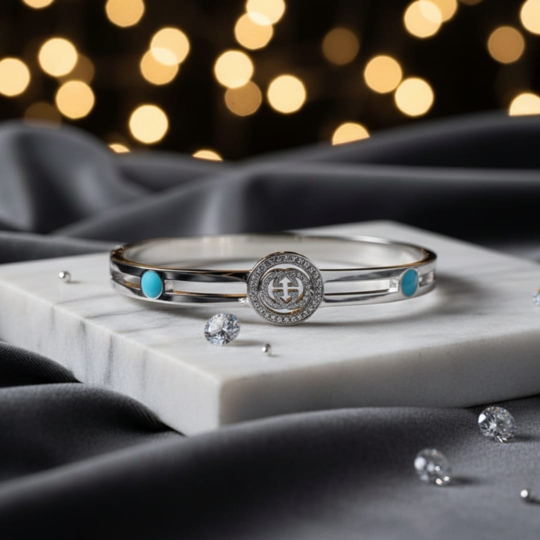Elevate your elegance with this stunning Turquoise Charm Silver Bangle. Crafted from polished silver, this bracelet features two vibrant turquoise stones on each side of a radiant circular centerpiece adorned with sparkling crystals. The intricate detailing and balanced design create a perfect blend of modern luxury and timeless sophistication. Ideal for both day and evening wear, this bangle adds a touch of refined glamour to any ensemble — a must-have statement piece for the stylish and confident woman
