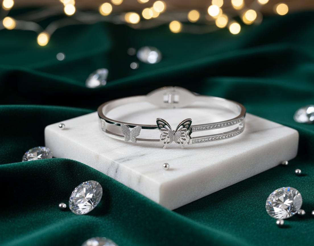 Delicate yet dazzling, the Silver Butterfly Elegance Bangle embodies grace and transformation. Crafted in polished silver, this enchanting piece features twin butterfly motifs β one intricately detailed and the other adorned with sparkling crystals β symbolizing beauty and renewal. The dual-band design enhances its modern sophistication, while the fine pavΓ© accents add a touch of radiant glamour. Perfect for gifting or adding a whimsical sparkle to your own collection, this bangle brings effortless elegance to every occasion.